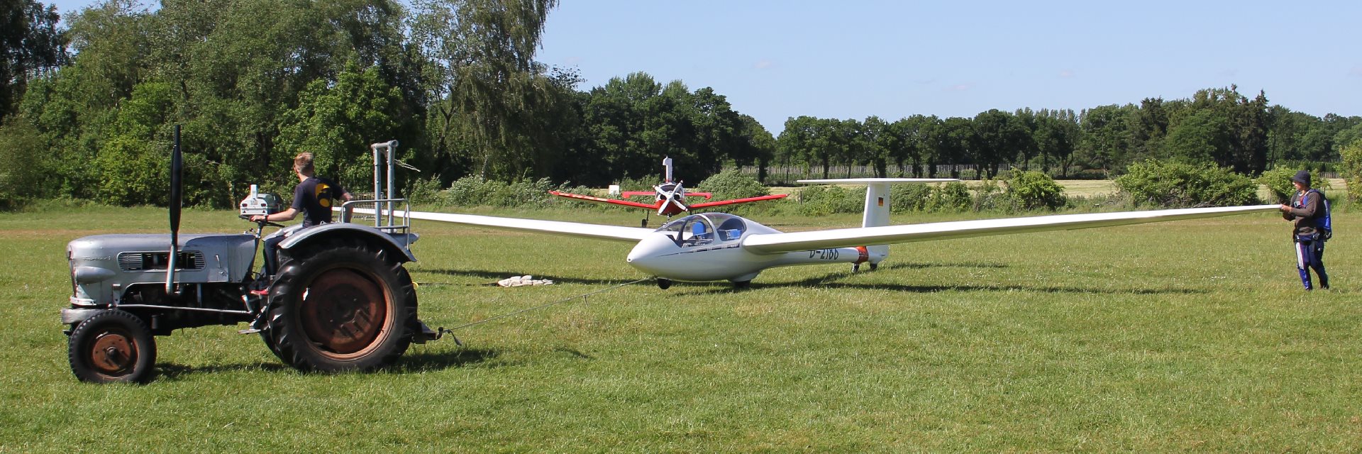 Unsere Moran (Saulnier) darf als Schleppflugzeug auch auf unserem Platz starten. Mit ihr können sich die Segelflugpiloten zur gewünschten Wolke und/oder Höhe schleppen lassen. Das kostet zwar mehr als ein Windenschlepp, verspricht aber mit einem Start eine bessere Ausgangsposition und -höhe.